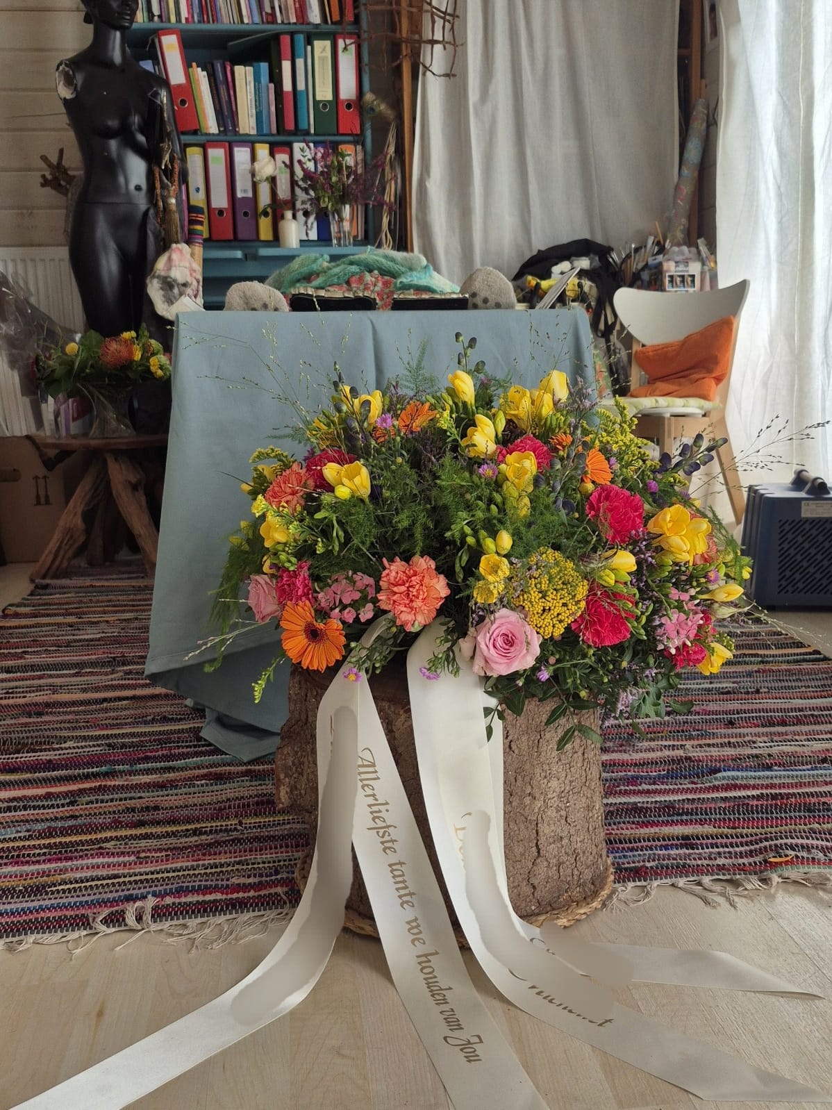 Direct na het overlijden begeleidde Alma ons bij het dragen van Carolien - gewikkeld in doeken - van haar huis naar haar atelier. Het gebeurde met zoveel bewustzijn, rust en respect, dat het ons diep raakte. Alma sprak haar toe, stond stil bij de verplaatsing en maakte ruimte voor wat wij zagen als “een zacht overgaan van de ziel”. In het atelier volgde een speciaal zielritueel, zorgvuldig en liefdevol uitgevoerd.